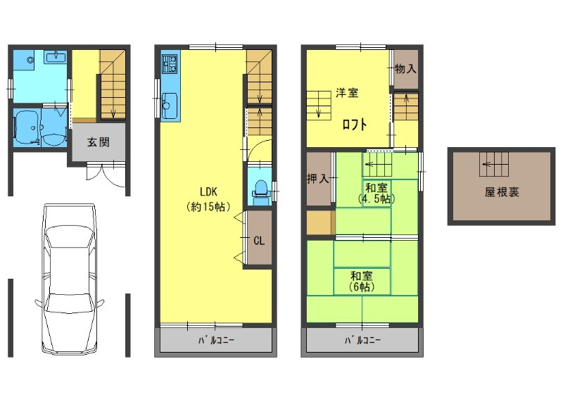 | 設備・条件 | 2人入居可 ペット対応 ペット可能 保証人不要 敷金礼金0 ガスコンロ 三口コンロ 給湯 独立洗面台 シャワー バス・トイレ別 W.INクローゼット ロフト付き TVドアホン 都市ガス 公営水道 駐車場有 バルコニー フローリング | ||